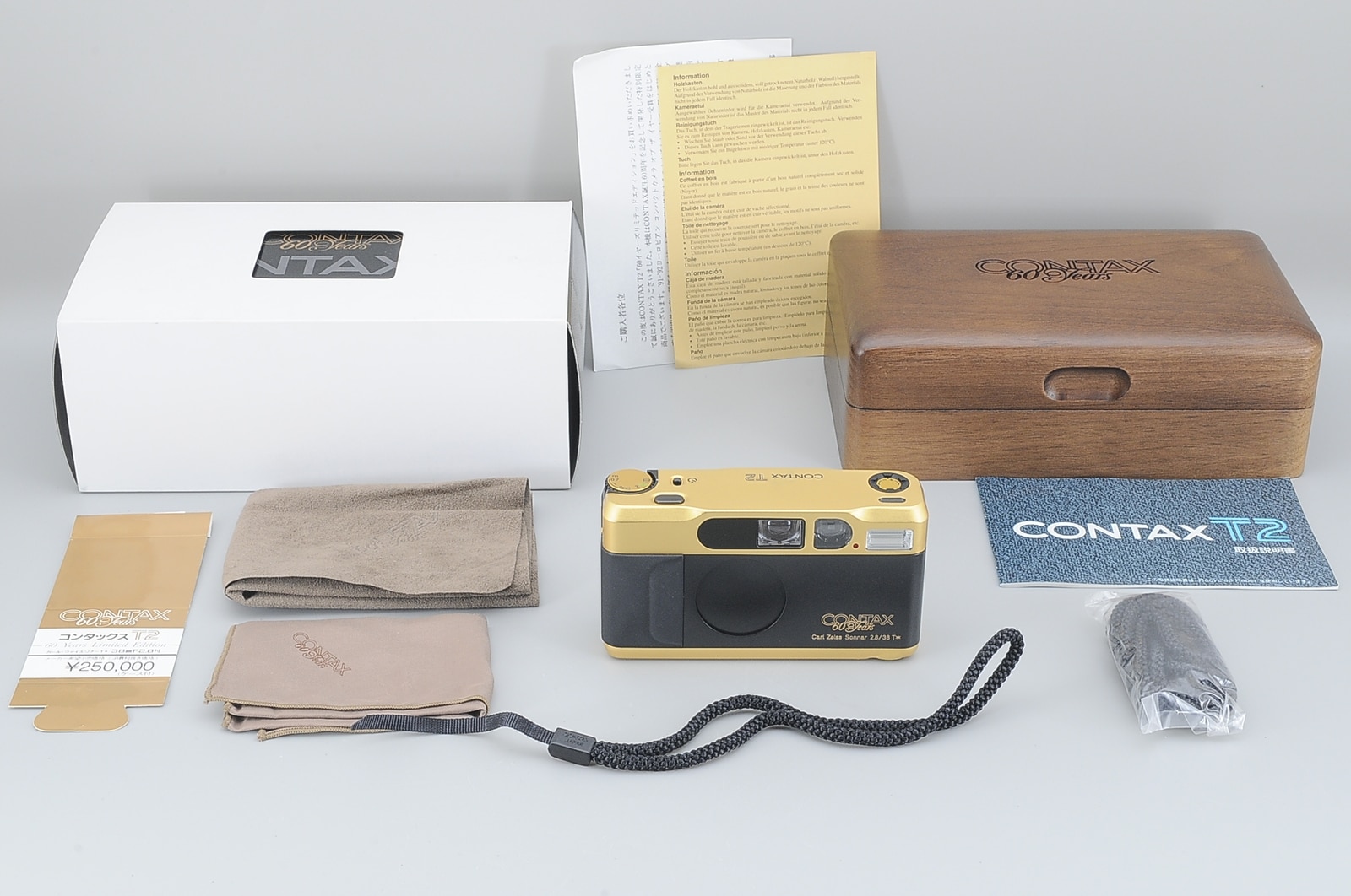 人気コンパクトフィルムカメラのT2の限定ゴールドカラーモデルです。こちらは60周年記念限定モデルですが、通常モデルのゴールドカラーのT2も存在します。どちらも現在ではなかなか希少で、買取価格に差はありません(当店の場合)。今回のお品は、あまり使用感が感じられない比較的状態の良い良品という状態でした。